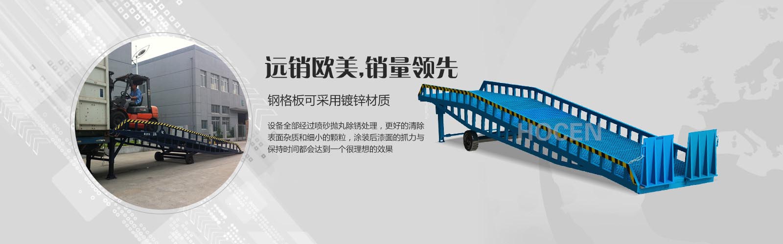 移動(dòng)液壓登車橋是與叉車配合使用的貨物裝卸專用輔助設(shè)備,有了它,叉車能直接從地面進(jìn)入汽車車廂內(nèi)進(jìn)行裝卸貨物的作業(yè)。